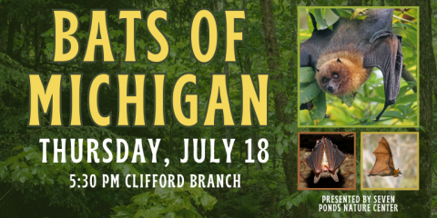 Primary tabs Upcoming List Month Week Day Add To My Calendar Print Share Program Type: Nature, Summer Reading Program Age Group: Kids, Families Please note you are looking at an event that has already happened. Registration is required for this event. Registration is no longer available for this event. Program Description Event Details Learn about Michigan bats, their habitat, food & more! Presented by Seven Ponds Nature Center.