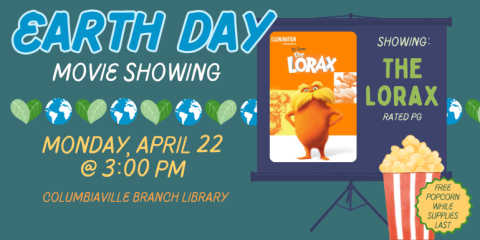 Celebrate Earth day and join us for a movie showing of Dr. Seuss’s The Lorax (rated PG) and free popcorn while supplies last!