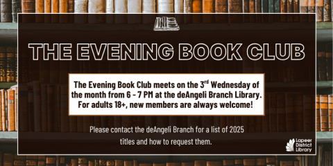 The Evening Book Club meets on the 3rd Wednesday of the month from 6-7 PM at the deAngeli Branch. For adults ages 18+. Registration is not required and new members are always welcome.