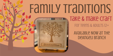 Create your own family tree! Materials include 7 or 8 hearts and a Family or Grandchildren option. For anyone ages 12+. Pick up now at the deAngeli Branch Reference Desk!