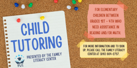 Child Tutoring: Tutoring is for elementary children between grades 1st through 4th who need assistance in reading and/or math. Kids will have one-to-one instruction with a trained tutor. Students gain confidence and skills through learning games, reading time, and skill-focused activities. Spaces are limited. Registration is based on availability. For more information and to sign up, please call the Family Literacy Center at (810) 664-2737.