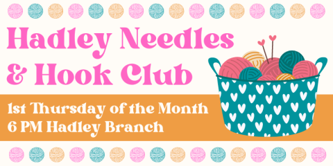 Bring your knit, crochet, or other needle art project for an enjoyable evening with other like-minded crafters. The Needles and Hook Club meets on the first Thursday of the month from 6 pm to 7 pm at the Hadley Branch Library. All are welcome to drop in and share ideas, tips, and friendly conversation.