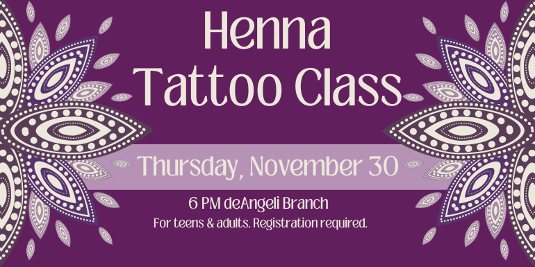 Learn how to apply and create designs using henna paste with Henna artist Dalia Hartman. All supplies will be provided.