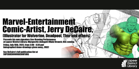 Jerry DeCaire has illustrated many of the world's biggest names in comics, graphic novels and cinema which include Deadpool, Thor, Wolverine, Hawkeye and Iron Man. Watch his live drawing performance as he shows you how he creates MARVEL-ous characters (you might be lucky enough to take a drawing home!). A demonstration that any super hero fan wont want to miss! Best for ages 9-99!