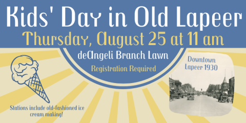 Have you ever wondered what it would be like to be a kid in "Old Lapeer"? Join us for an all ages Storytime inspired by years gone by and join in on the fun with different interactive stations and old fashioned ice cream making. Event will be held on the lawn. Please register for any updates. In case of rain, we will have to reschedule.