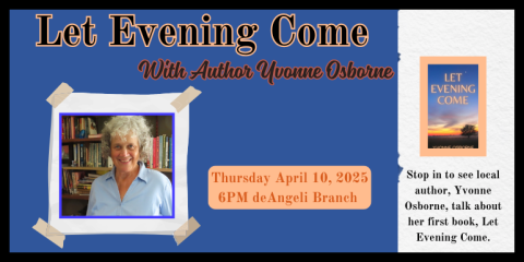 Stop in to see local author, Yvonne Osborne, talk about her first book, Let Evening Come. Let Evening Come is the love story between the son of an Indigenous family displaced from their ancestral home on the Tar Sands of Canada and a motherless farm girl from Michigan. Together they combat suspicion and bigotry on both sides of the border and the cultural differences that separate them.