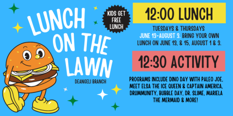 Join us every Tuesday & Thursday for a FREE lunch for children ages 0-18! Registration is required for lunches. To register, call the deAngeli Branch Children's Desk by noon the day before the program. You may register up to one week before each program.