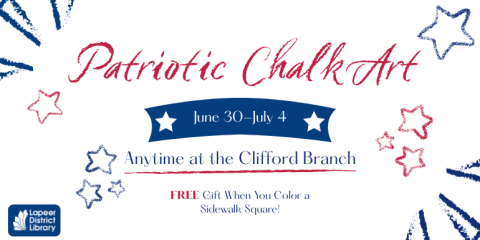 Celebrate your creativity and patriotic spirit at the library! Stop by during library hours to pick up chalk and decorate the sidewalks with your own colorful designs throughout the week. This is a self-guided activity, so you can join in anytime that works for you—and don’t forget, a special gift is available for the first five artists who stop inside the library to claim it!