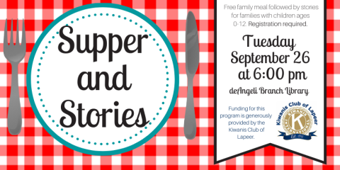 Free family meal followed by stories for families with children ages 0-12. Registration required. Funding for this program is generously provided by the Kiwanis Club of Lapeer.