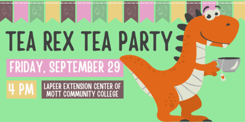 Join us at the Lapeer Extension Center of Mott Community College for a special Tea Rex Party! We will read Tea Rex by Molly Idle and have cookies and magic color-changing butterfly tea. A visiting dinosaur friend will visit and teach us how to dance like a dinosaur and how to properly sip tea.