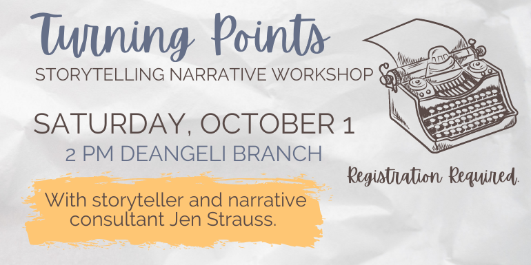 Join storyteller and narrative consultant Jen Strauss for Turning Points: Storytelling Narrative Workshop. Participants will learn how to explore their life story using a series of overlapping and self-exploring storytelling and writing activities.