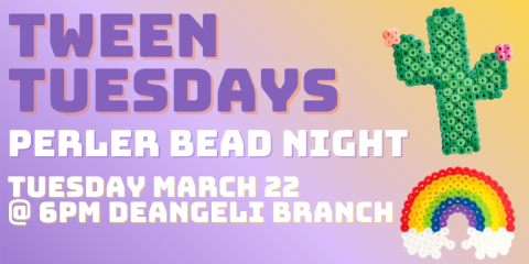 Primary tabs Upcoming List Month Week Day Remind Me Add To My Calendar Print Share Age Group: Kids, Families, Tweens Please note you are looking at an event that has already happened. Program Description Event Details Tweens are invited to make their own perler bead creations! Registration is required.