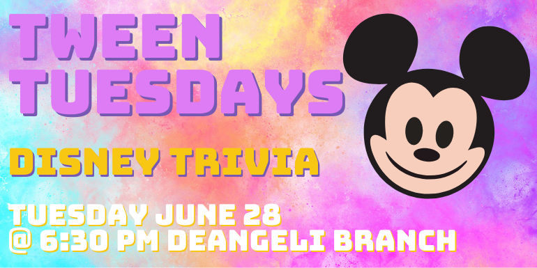 Primary tabs Upcoming List Month Week Day Add To My Calendar Print Share Age Group: Kids, Families, Tweens Please note you are looking at an event that has already happened. Registration is required for this event. Registration is no longer available for this event. Program Description Event Details Do you know Disney movies? Put yourself to the test! Light refreshments served. Costumes encouraged. For ages 8-12.