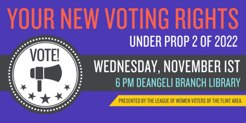 This program will feature the new rules that will be in effect for the 2024 elections including Early Voting, Permanent Mail Voter List, Improvements to Absentee Voting, Election Integrity, Voter ID and other topics. Presented by The League of Women Voters of the Flint Area.